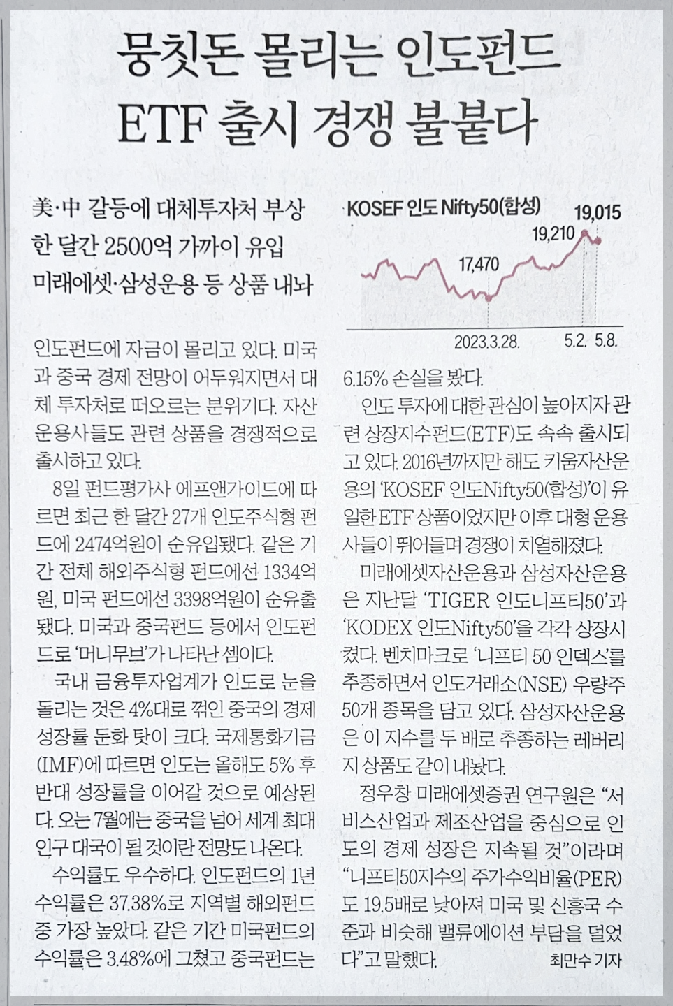 최근 중국의 당 정책과 미국의 대중 경제 압박 등의 이유로 세계적 제조업 공장 등의 인프라가 인도, 베트남, 필리핀 등으로 이동하고 있는 추세임. 인도 ETF에도 장기적인 투자를 하면 좋을 것 같음.