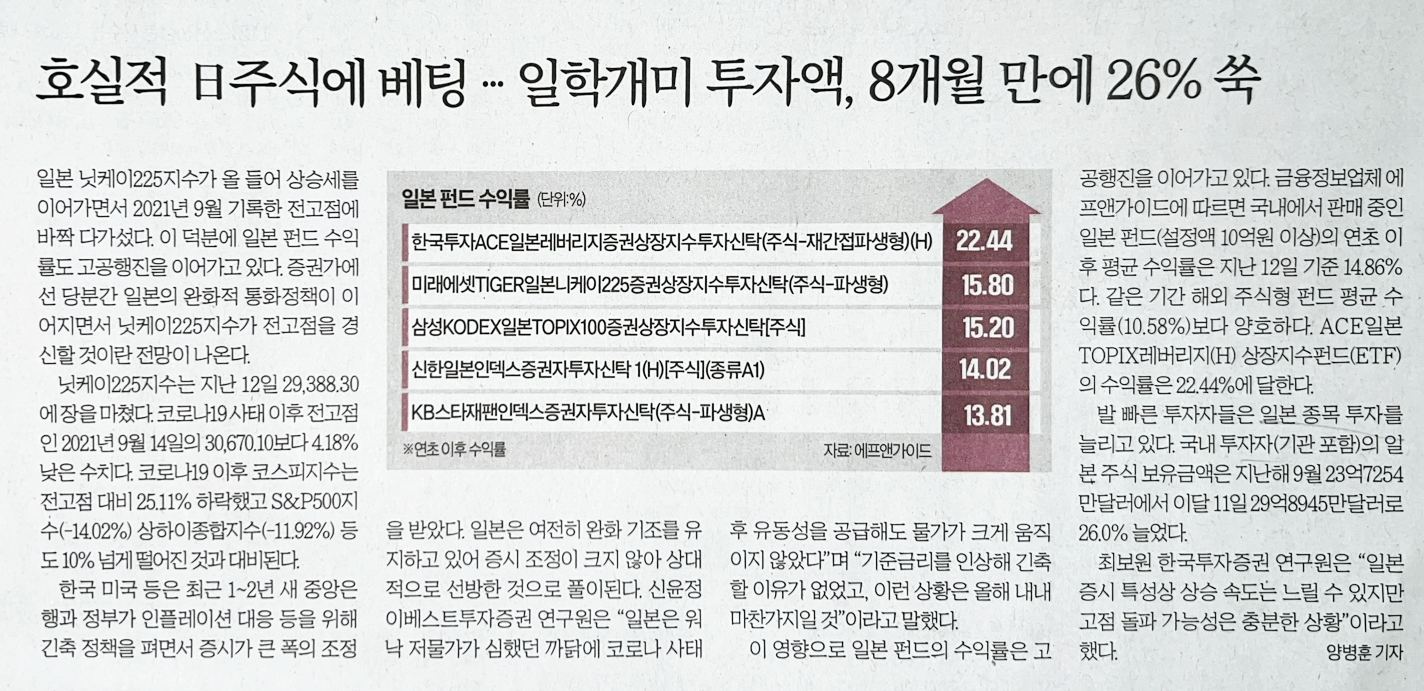일본증시 특성상 상승속도는 느릴 수 있지만 고점 돌파 가능성이 충분한 상황인 만큼 일본관련 펀드 등에 관심을 가져본다.